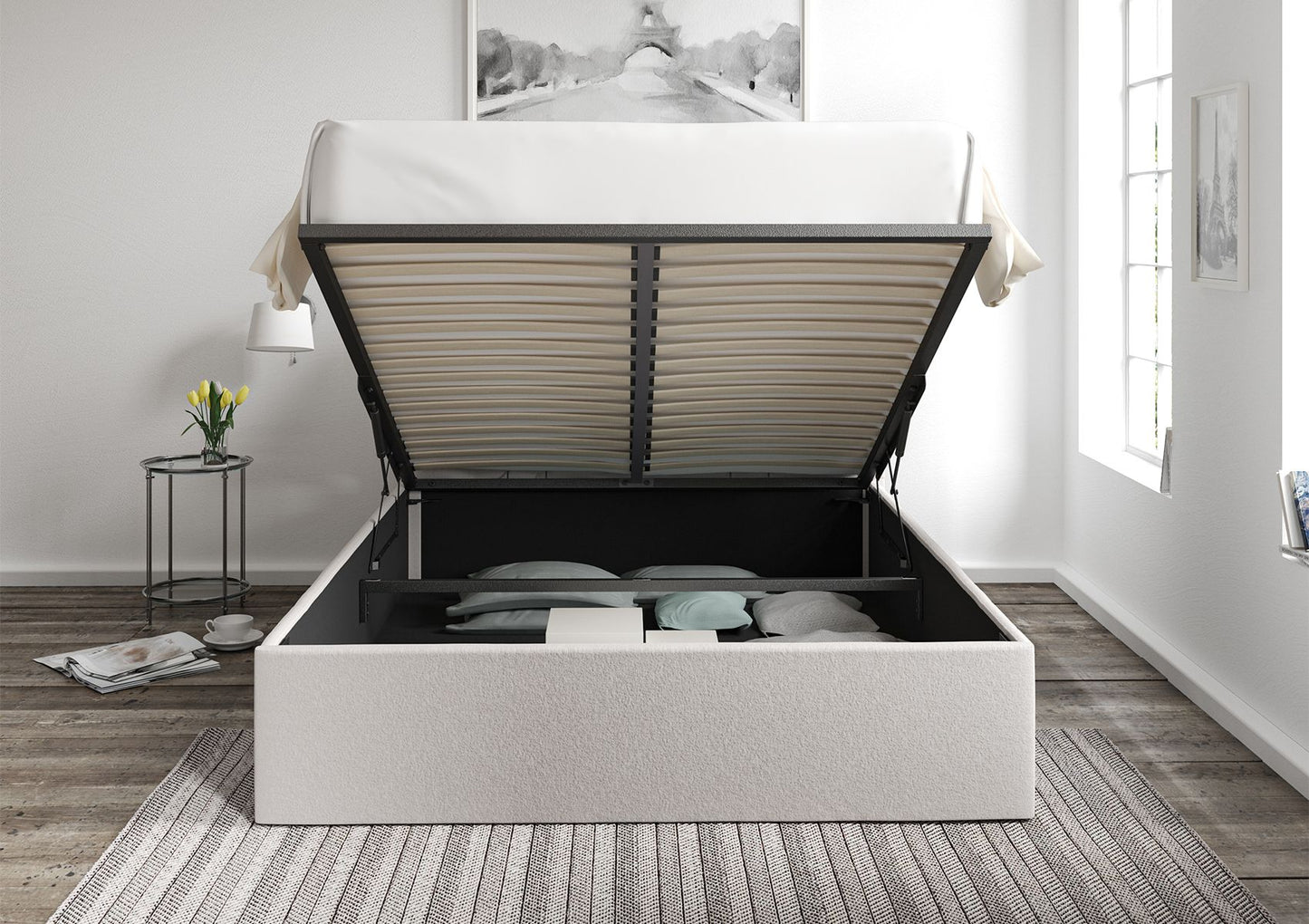 The slatted Ottoman base can be easily raised with the assistance of the gas lift struts to reveal a high-capacity storage area.
