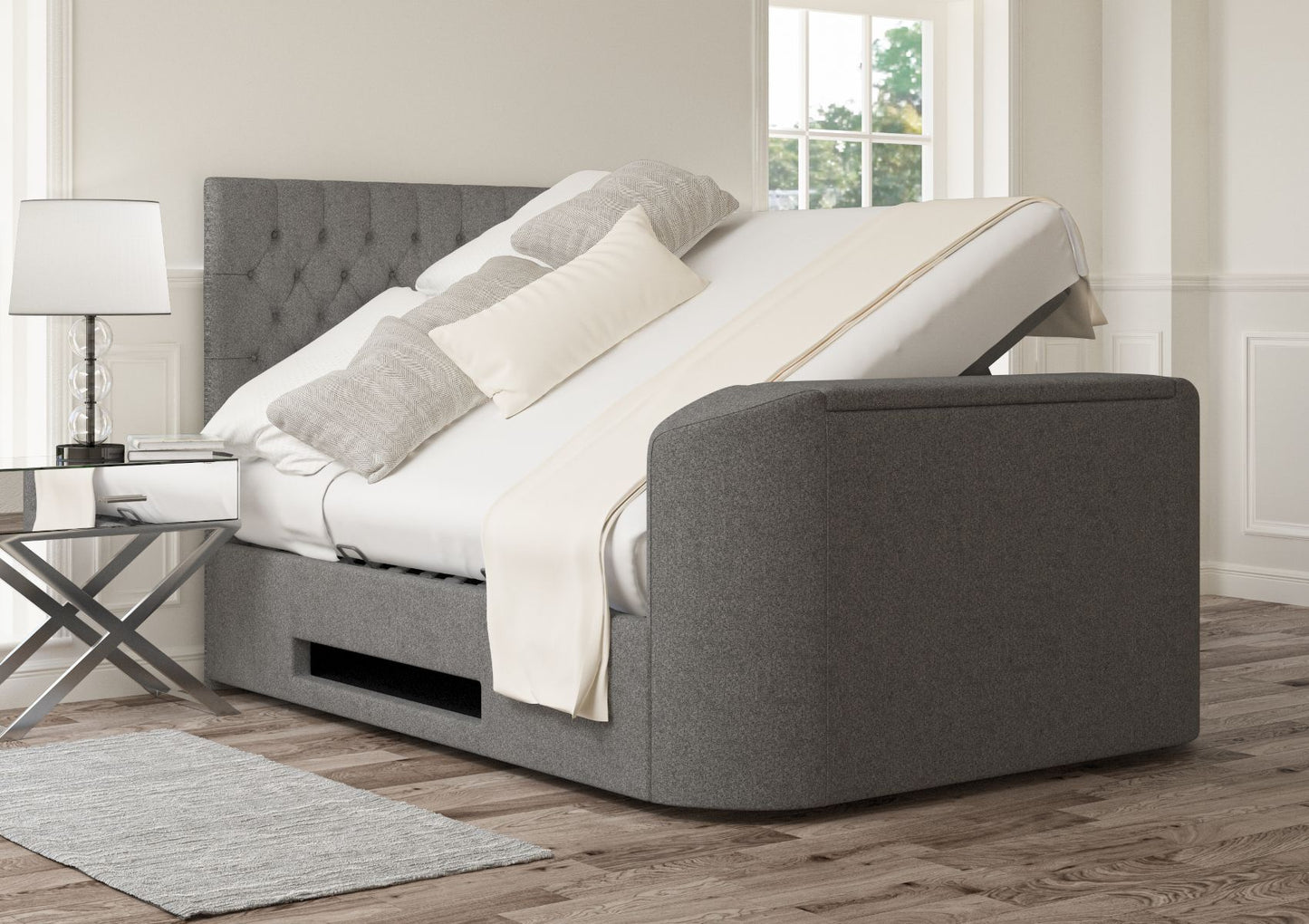 Loving upholstered in the UK the Claridge features the latest generation slimline foot end TV mechanism which features automatic cut off, so once your TV is lowered it automatically turns off. A shelf in the base of the bed enables DVD players and gaming consoles to be conveniently stored.