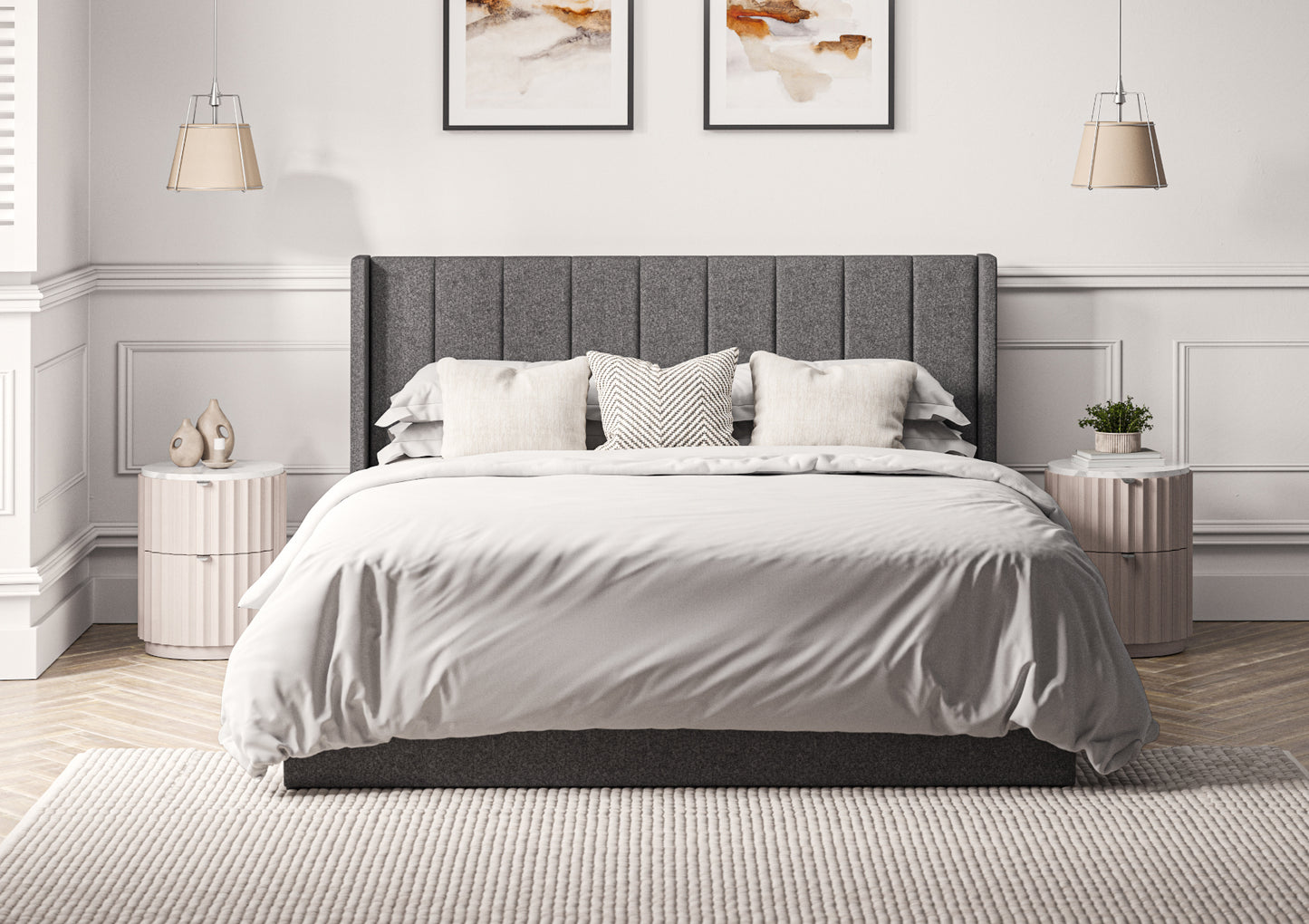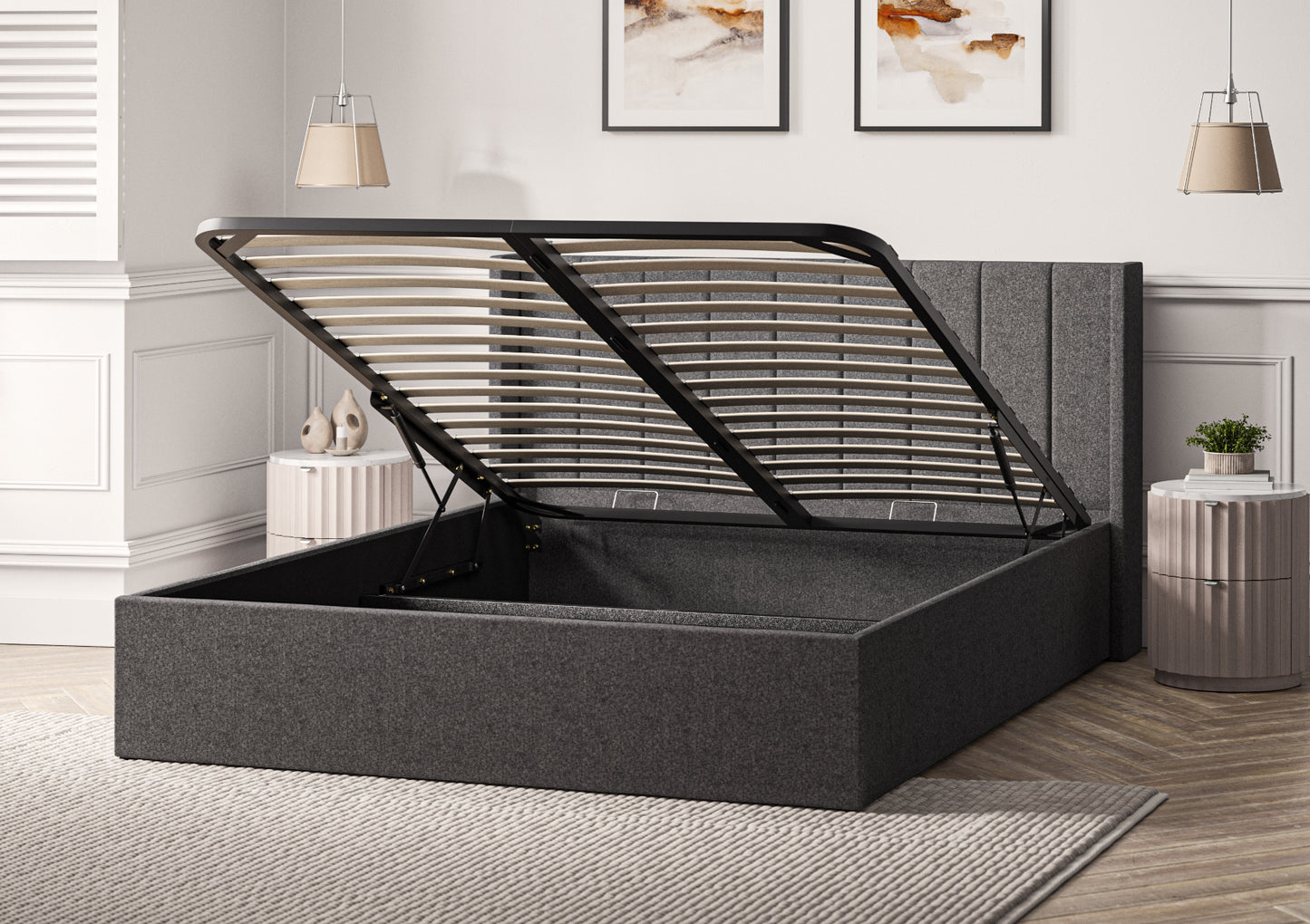 Transform your bedroom into a sophisticated sanctuary with the Harmony Winged Ottoman Bed, where contemporary design meets practical storage solutions.