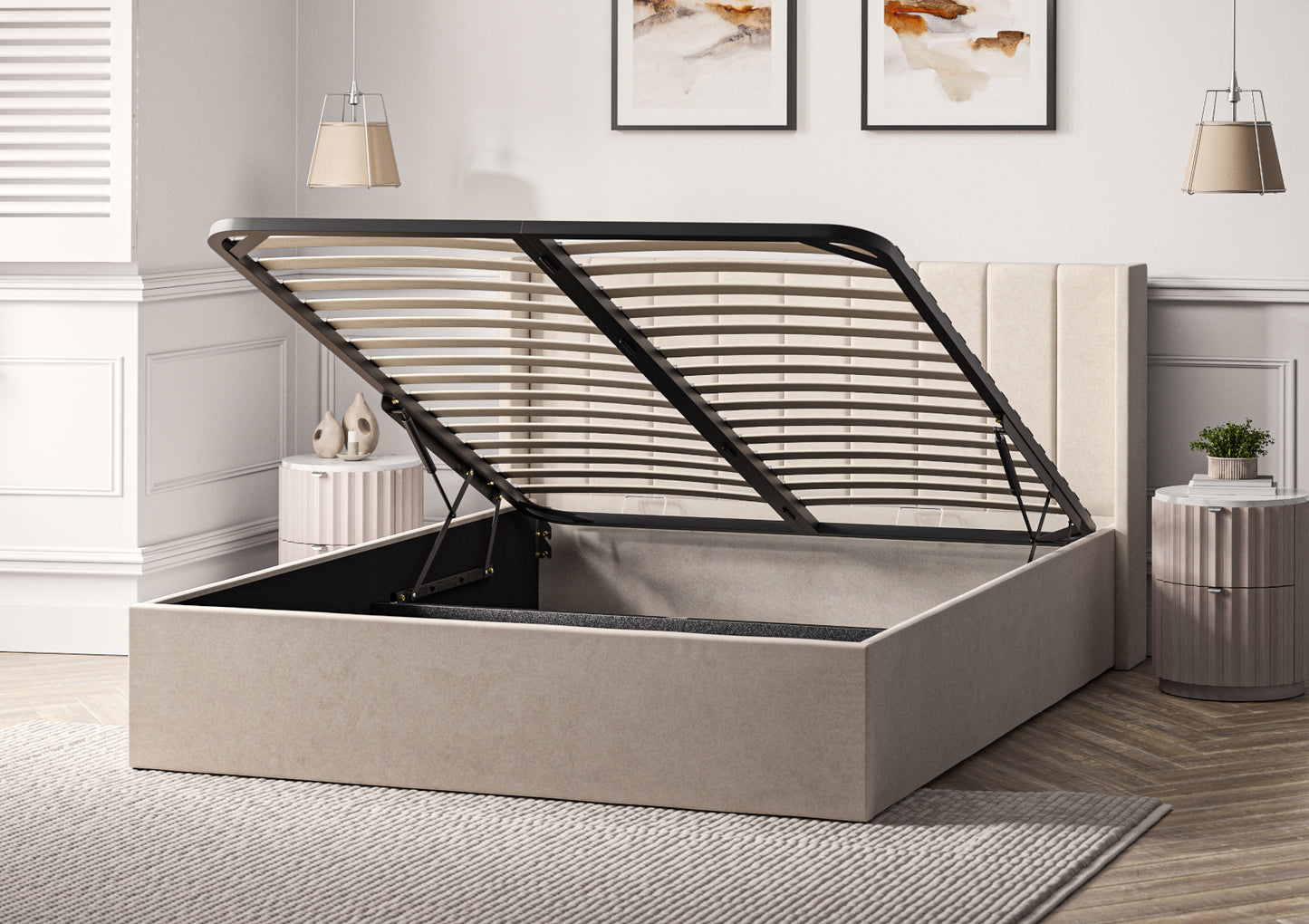 Transform your bedroom into a sophisticated sanctuary with the Harmony Winged Ottoman Bed, where contemporary design meets practical storage solutions.