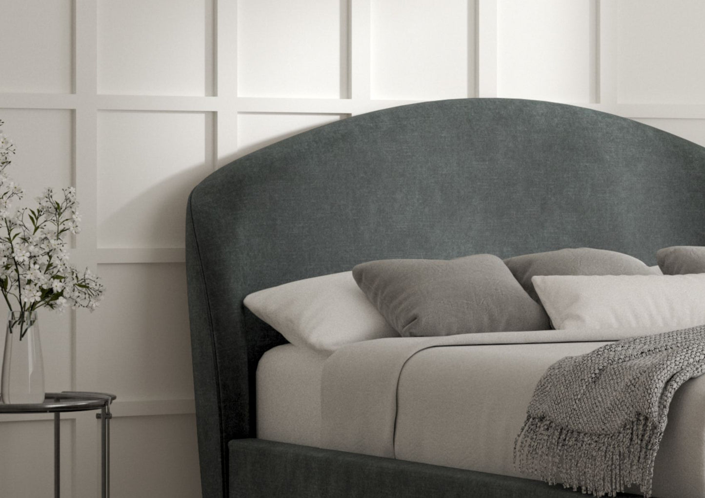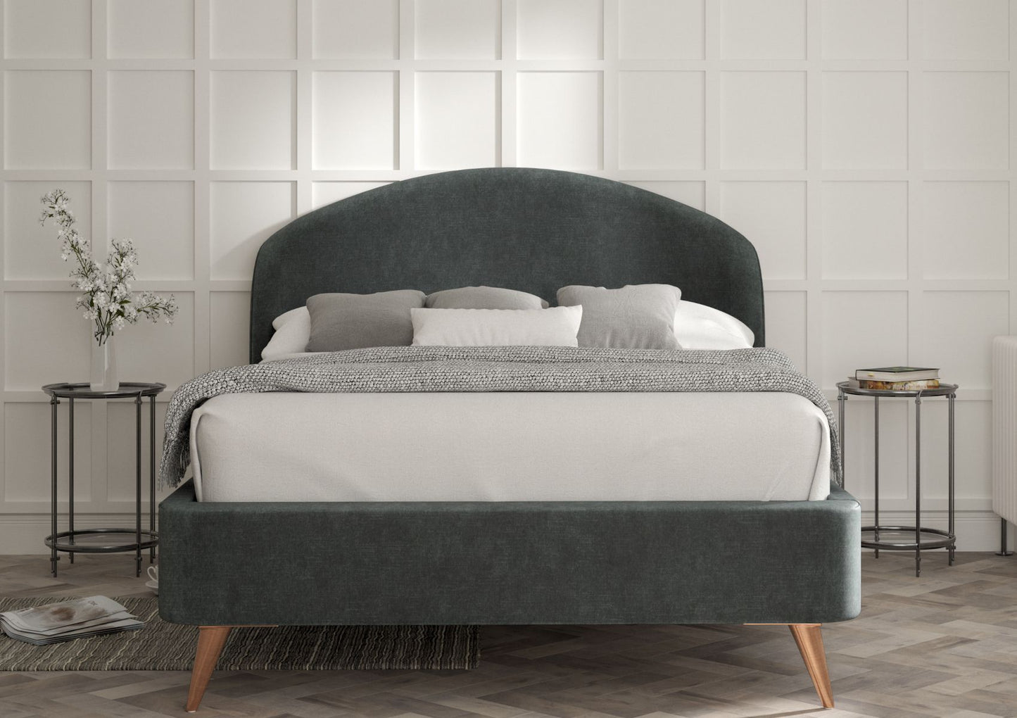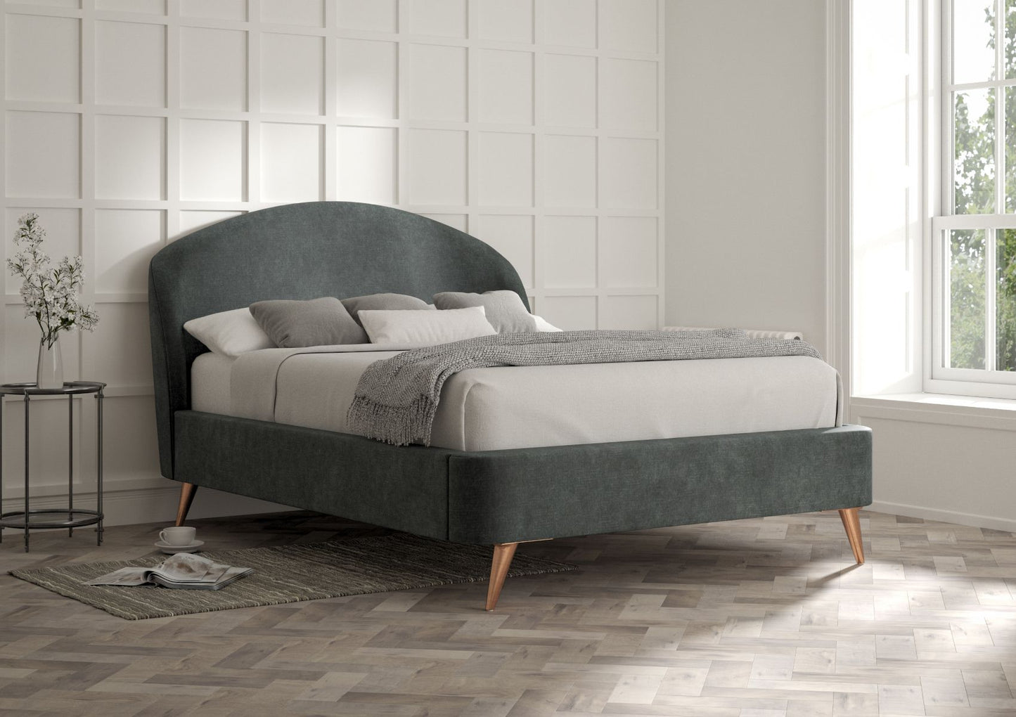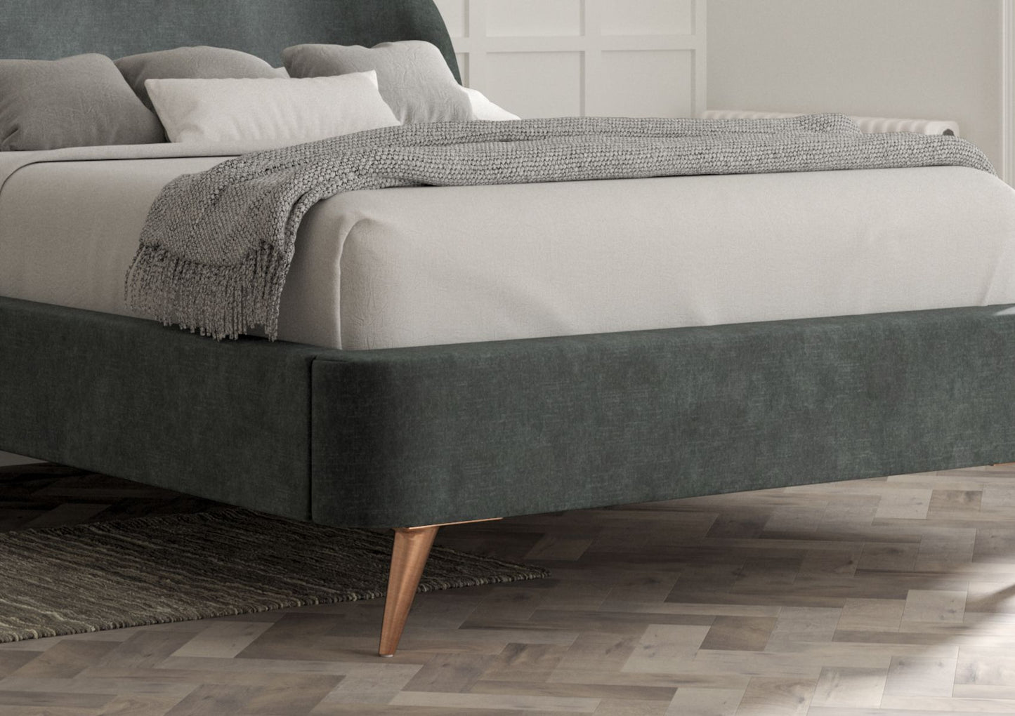 The copper legs on this bed give this bed a very on trend feel. Gentle curves, luxurious upholstery combined with simplicity combine to make this a stylish and contemporary addition to our range. Each bed is lovingly handmade to order in Yorkshire.