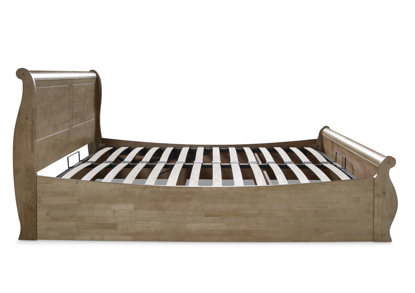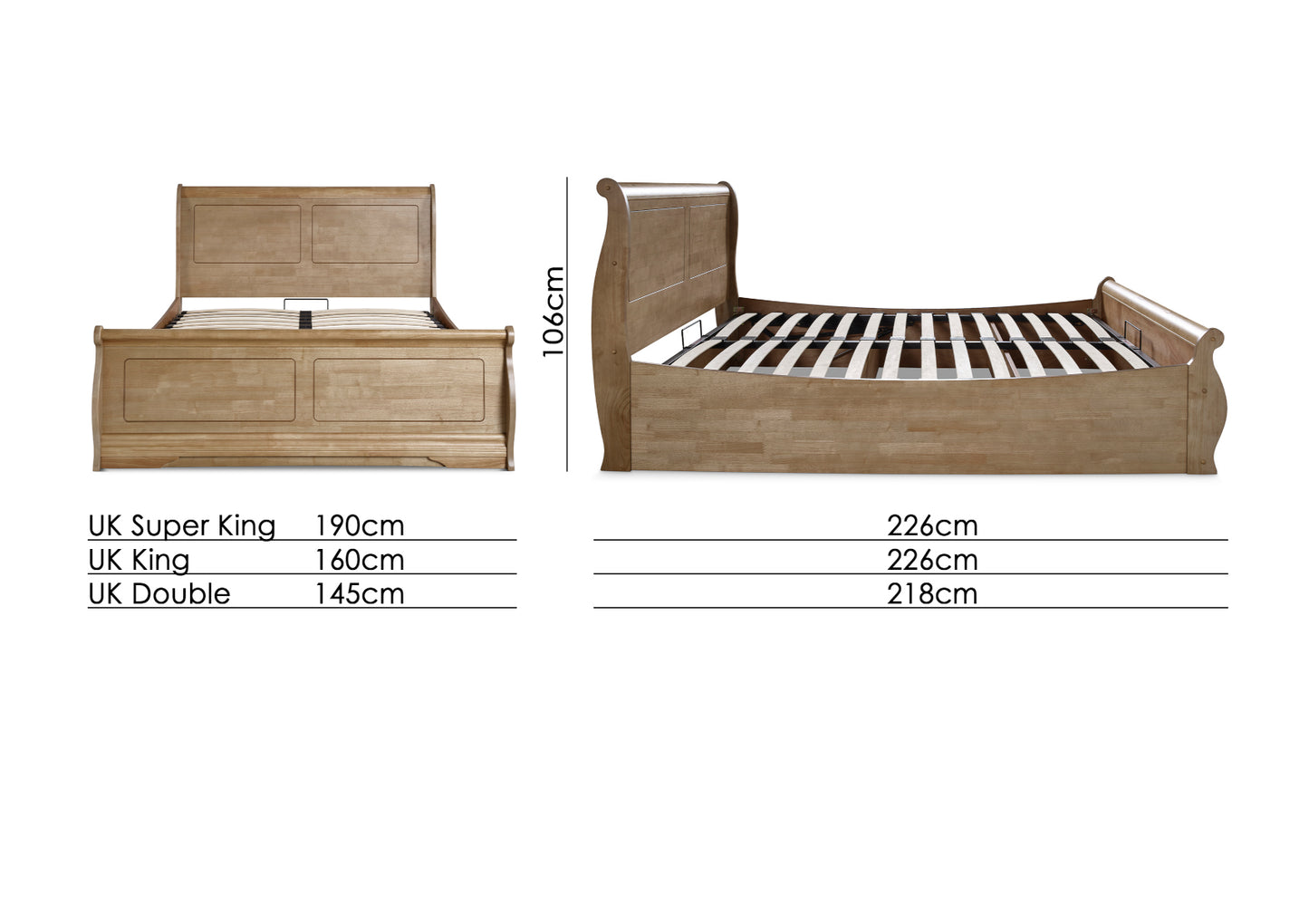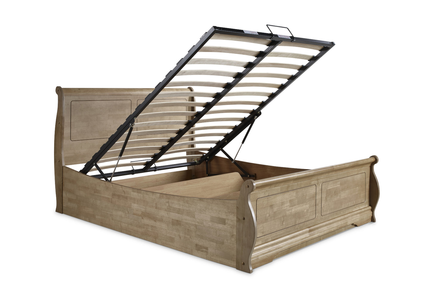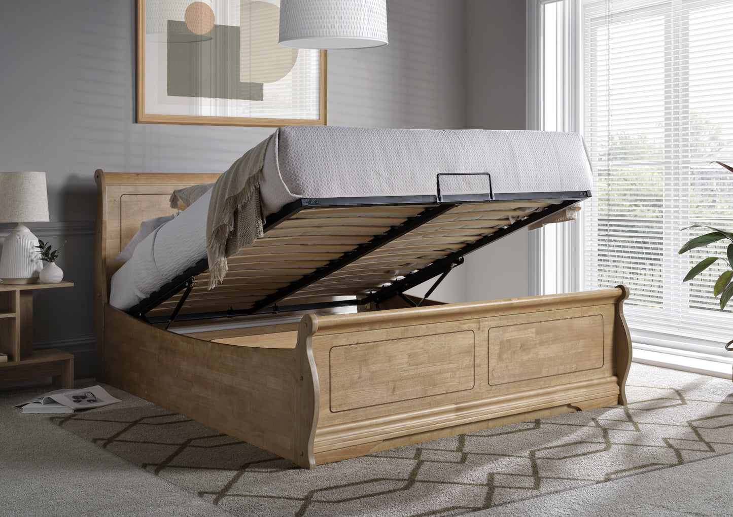Our Marseille combines classical elegance with the versatility of ottoman storage. The sprung slatted base can be easily raised and lowered with the gas lift ottoman system to reveal a generous fully boarded high capacity storage area. The beautiful Oak finish works equally well in either a traditional or contemporary setting. Graceful curves and sophisticated detailing, the Marseille will bring a mood of serenity and relaxation to any room. Manufactured from rubber wood and engineered timber the bed comes with a sprung slatted base for extra comfort and support.
