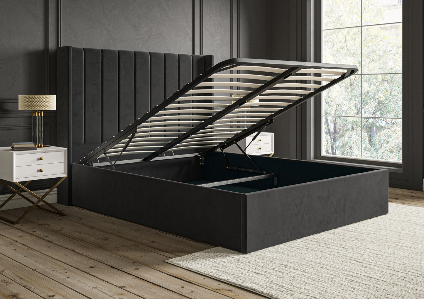 Transform your bedroom into a sophisticated sanctuary with the Opulence Winged Ottoman Bed, where contemporary design meets practical storage solutions.