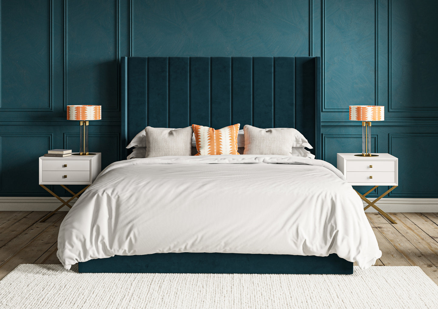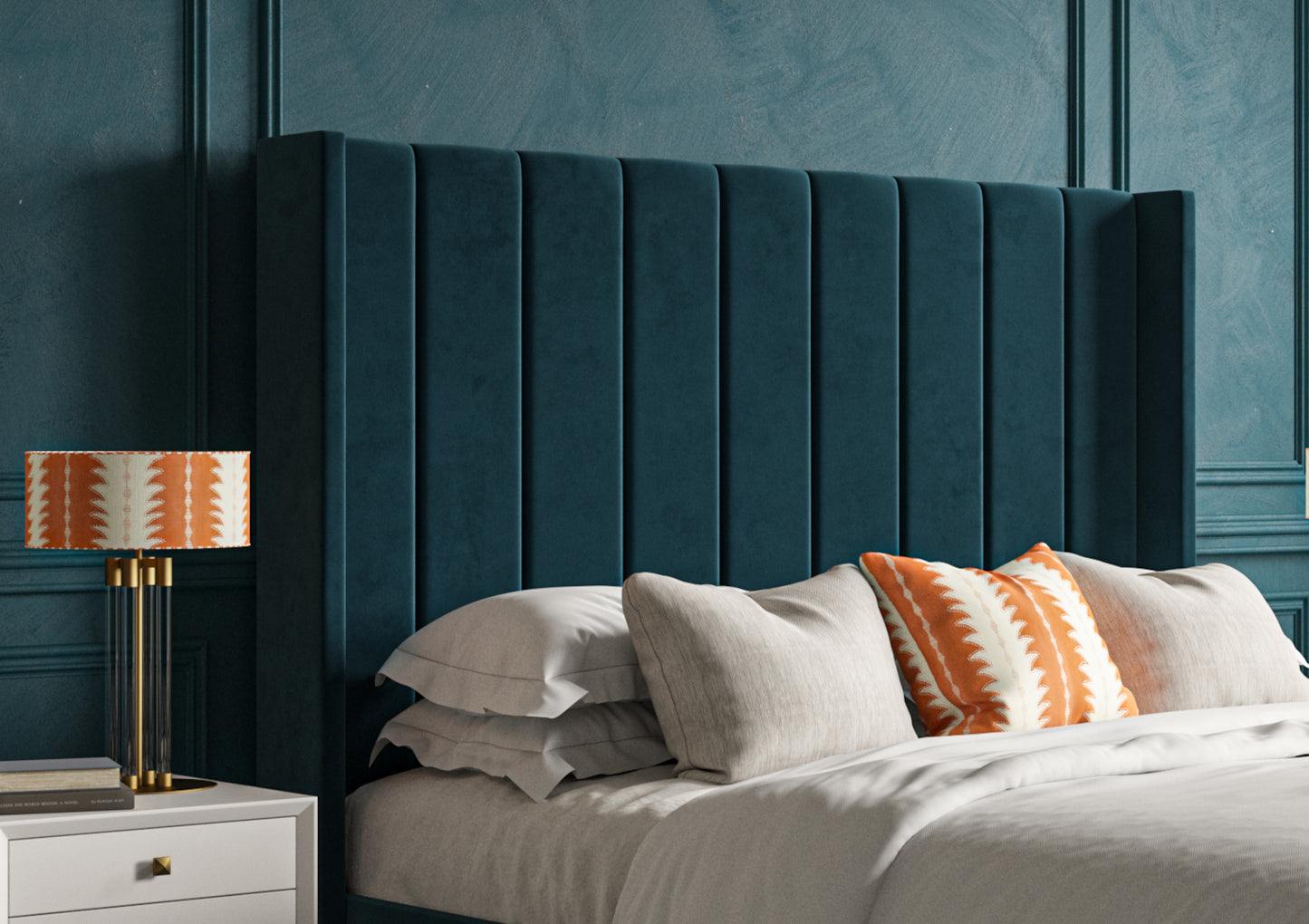 Generously proportioned winged headboard creates an impressive focal point