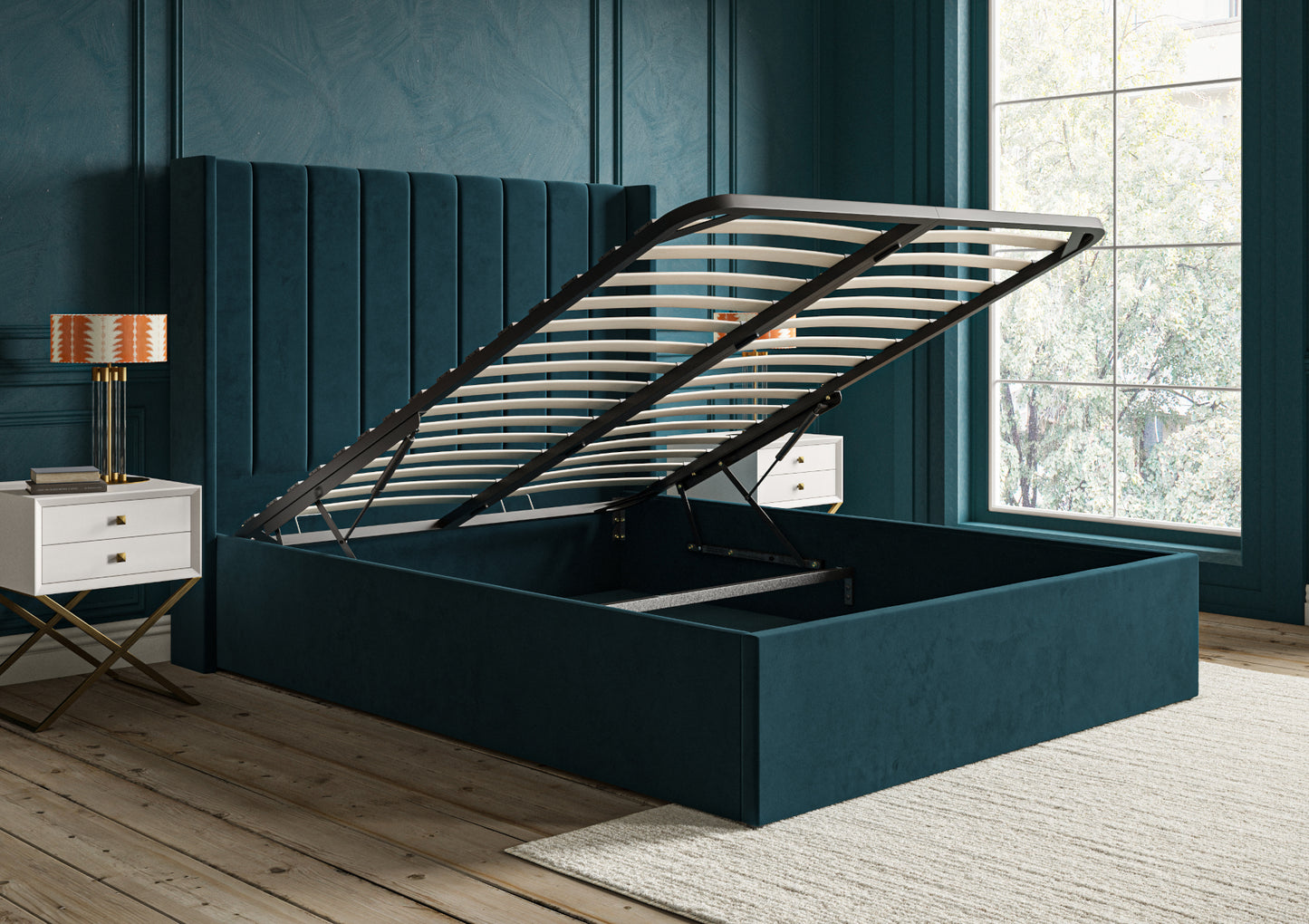 Opulence Winged Grand Hugo Kingfisher Upholstered Ottoman Bed Frame Only