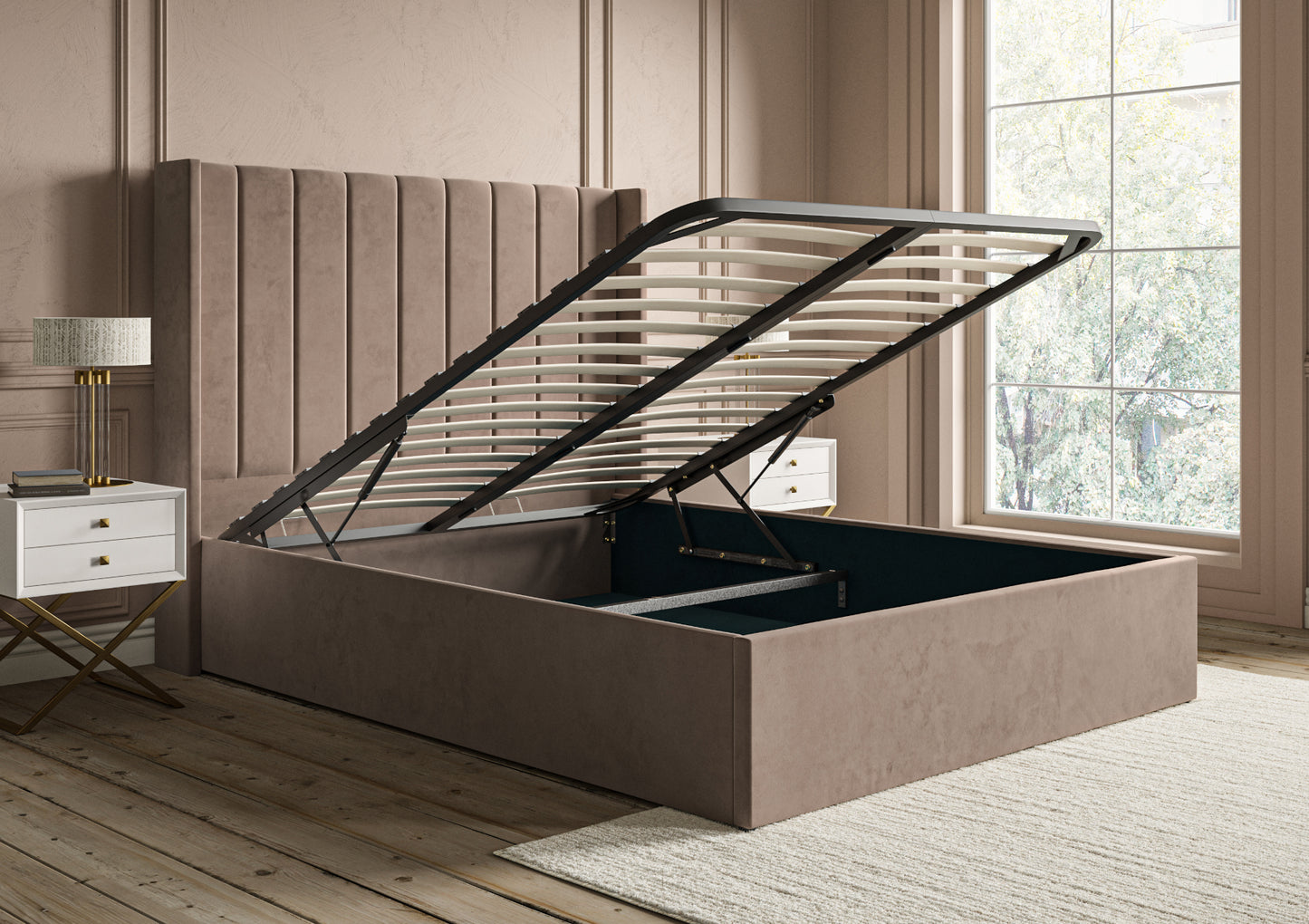 Transform your bedroom into a sophisticated sanctuary with the Opulence Winged Ottoman Bed, where contemporary design meets practical storage solutions.