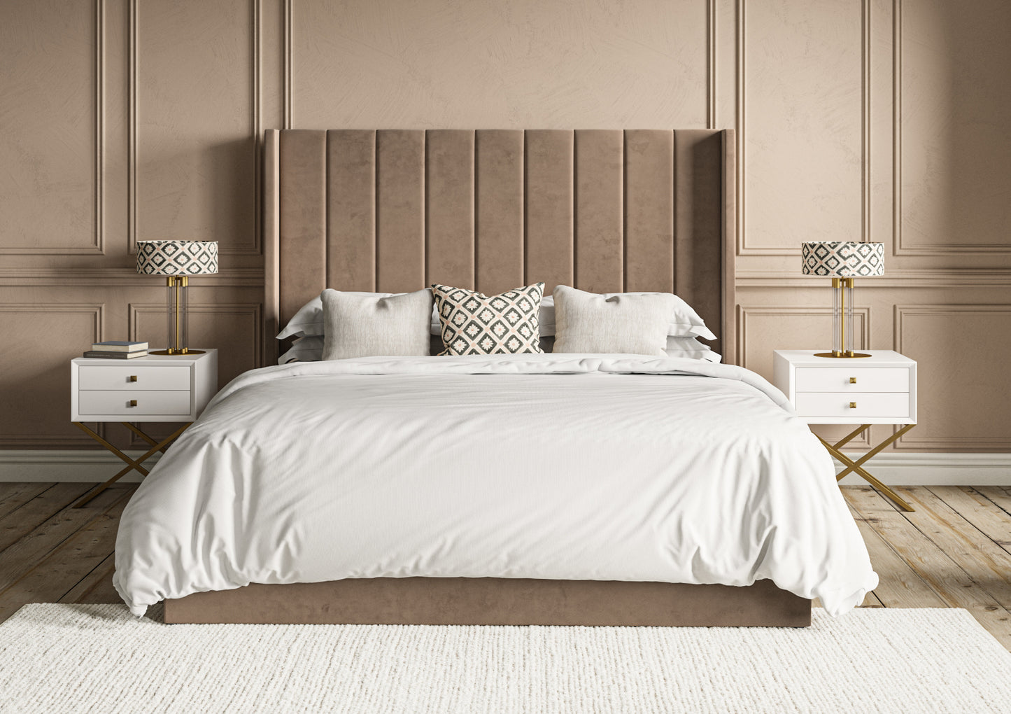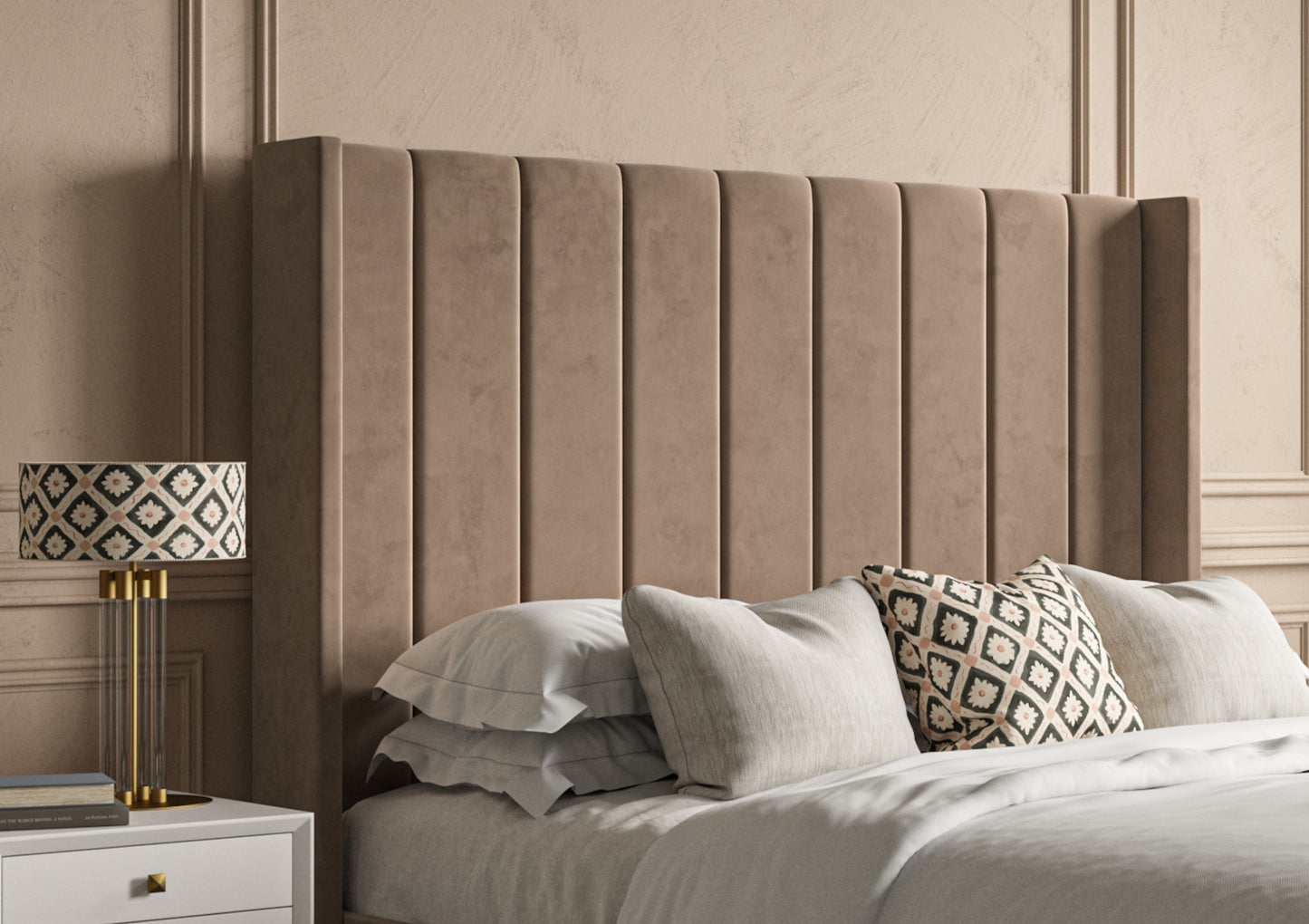 Generously proportioned winged headboard creates an impressive focal point