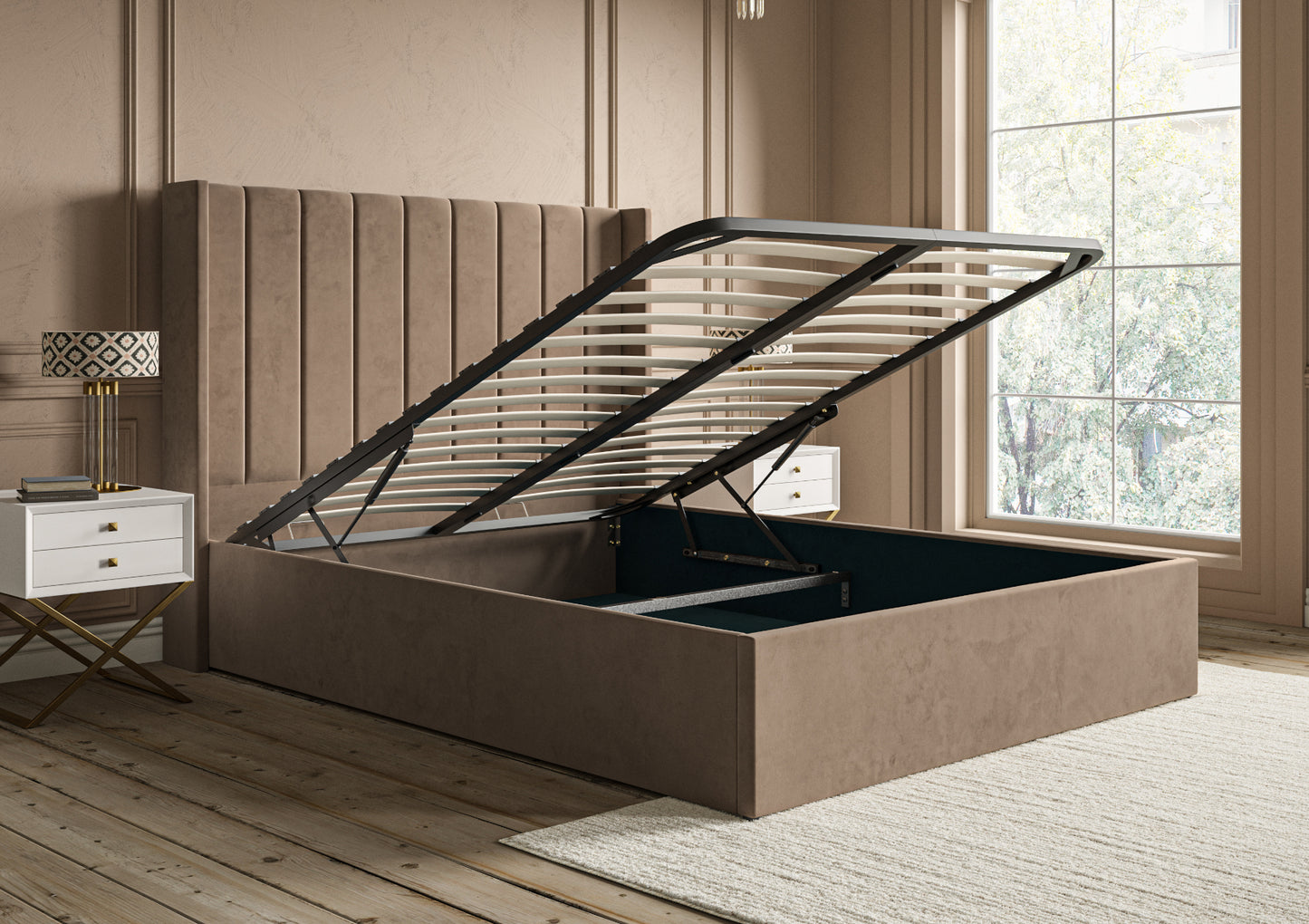 Transform your bedroom into a sophisticated sanctuary with the Opulence Winged Ottoman Bed, where contemporary design meets practical storage solutions.