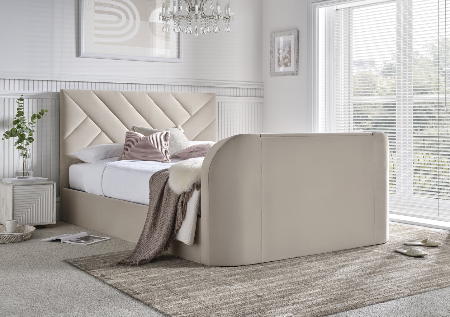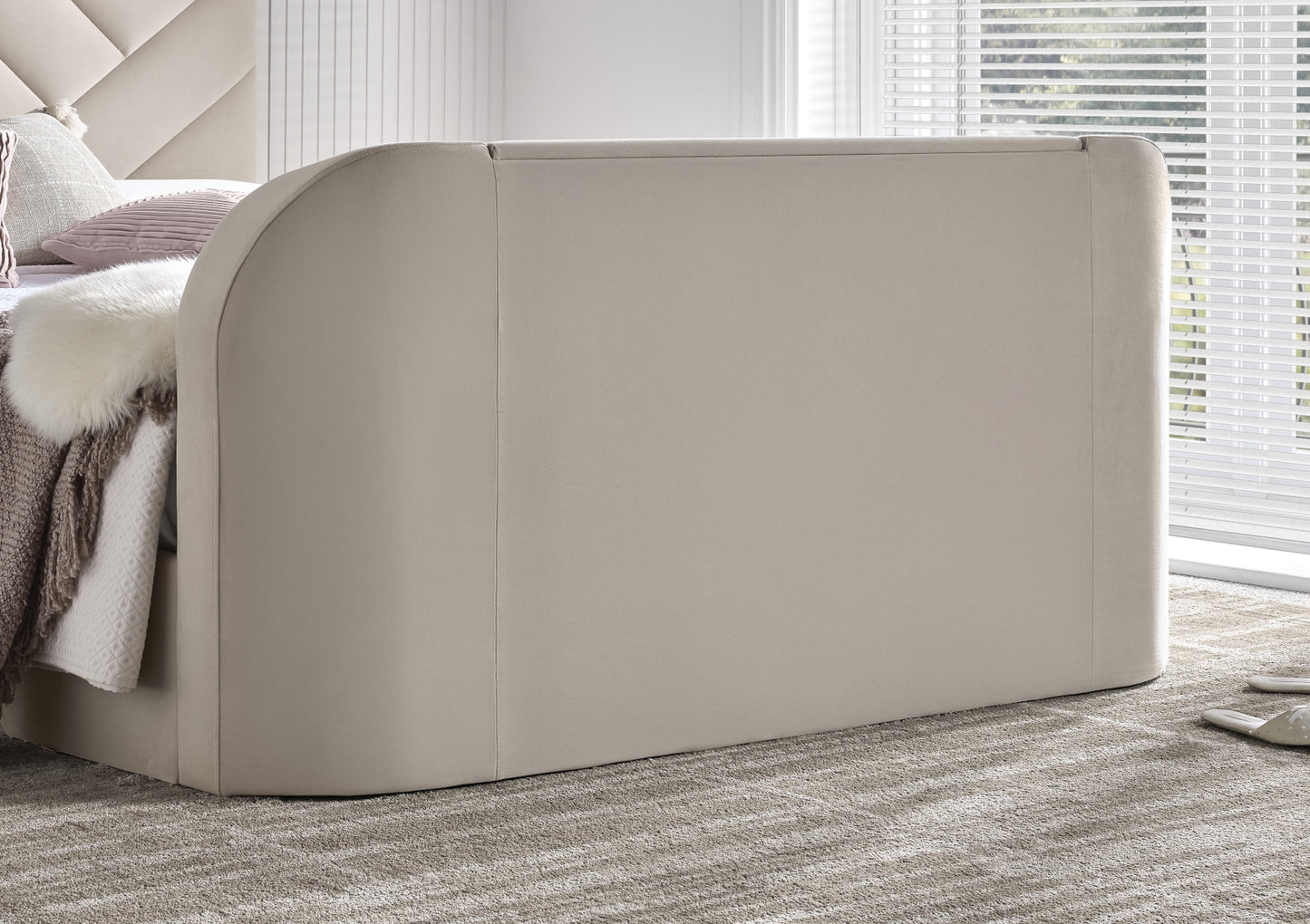 Upholstered in sumptuous natural stone velvet fabric, this stunning TV bed brings effortless elegance to your bedroom whilst delivering the ultimate in modern convenience. The rich, tactile velvet finish creates a beautifully versatile centrepiece that complements any décor, from contemporary minimalist to classic traditional styling.