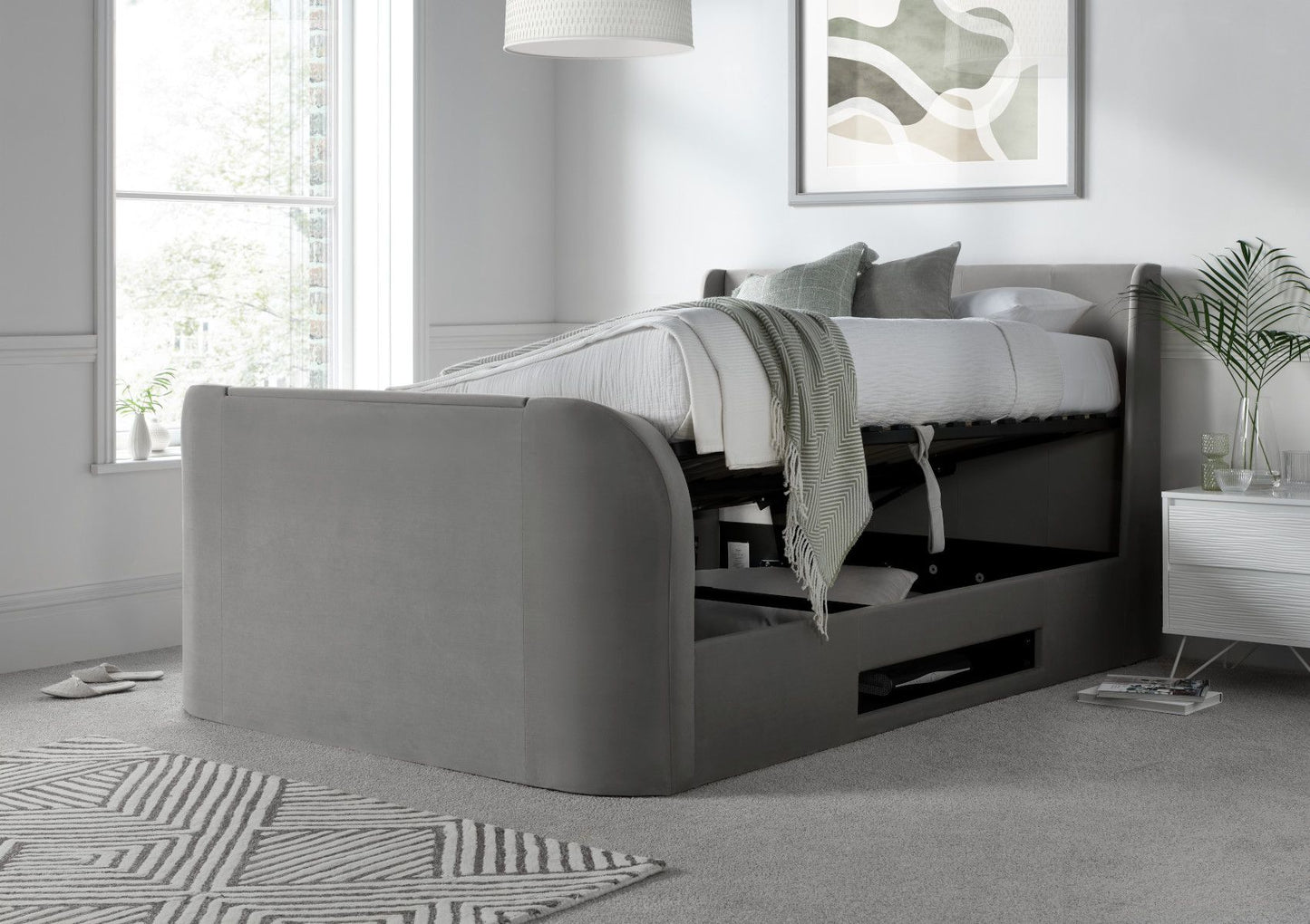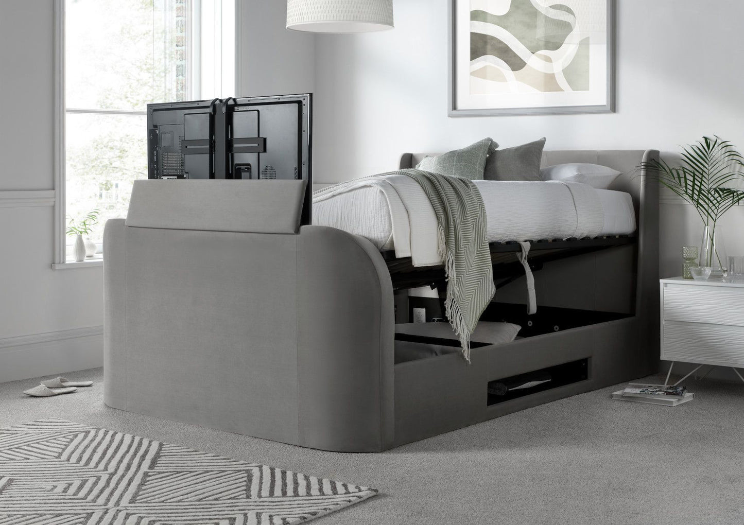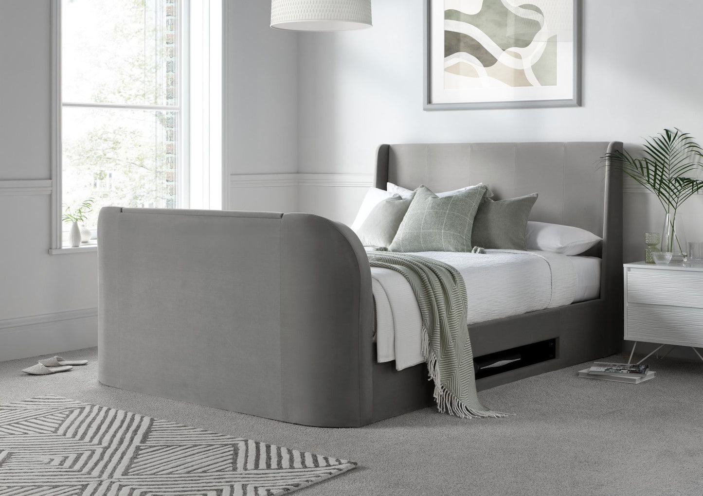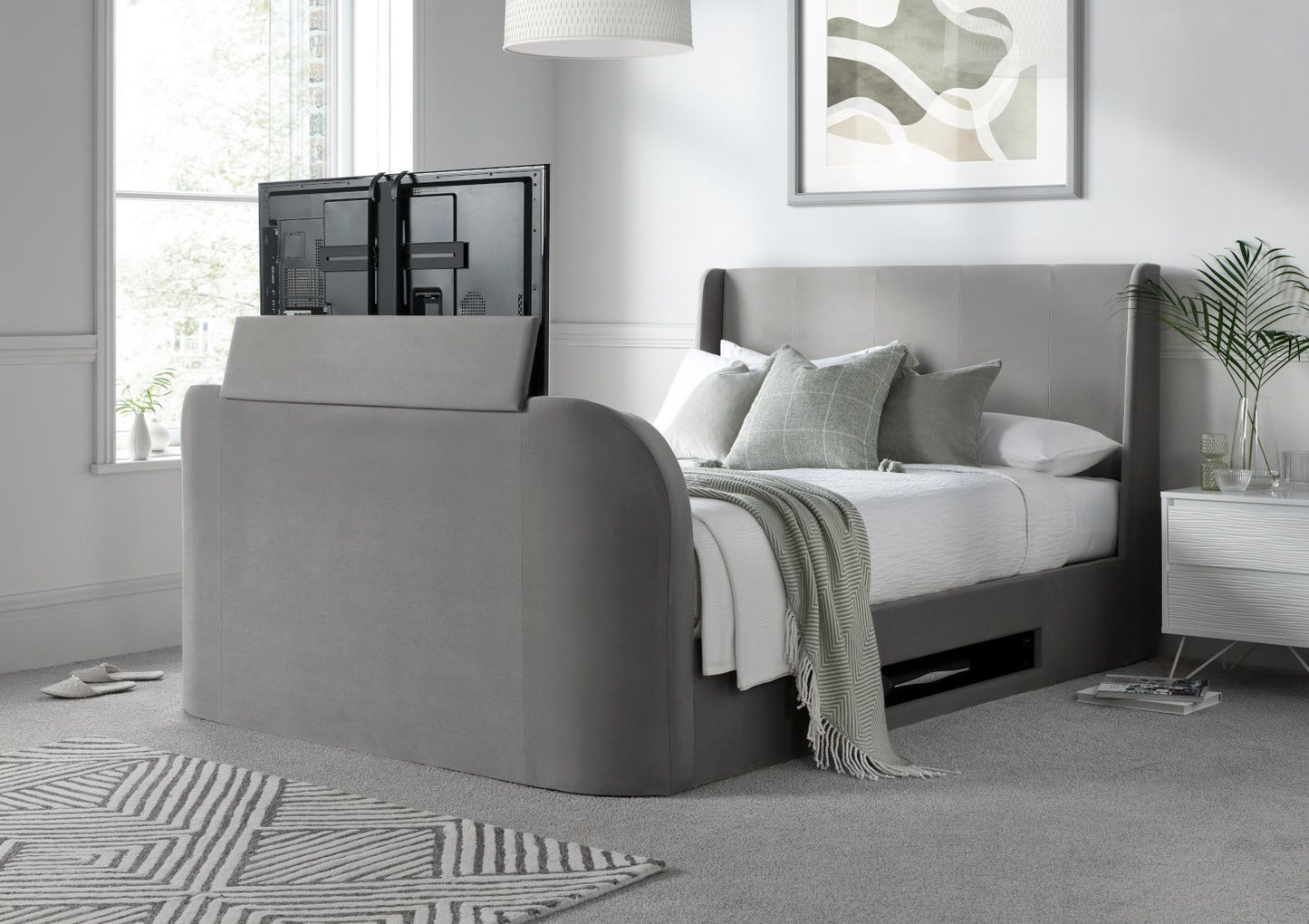 The Vancouver Ottoman Winged TV bed is the ideal choice for enjoying your favourite TV shows, movies, or video games from the comfort of your bed. With a remote-controlled TV lifting mechanism, this bed allows you to discreetly hide the TV when it's not in use. It can hold TVs up to 43 inches, with adjustable brackets to accommodate different sizes.