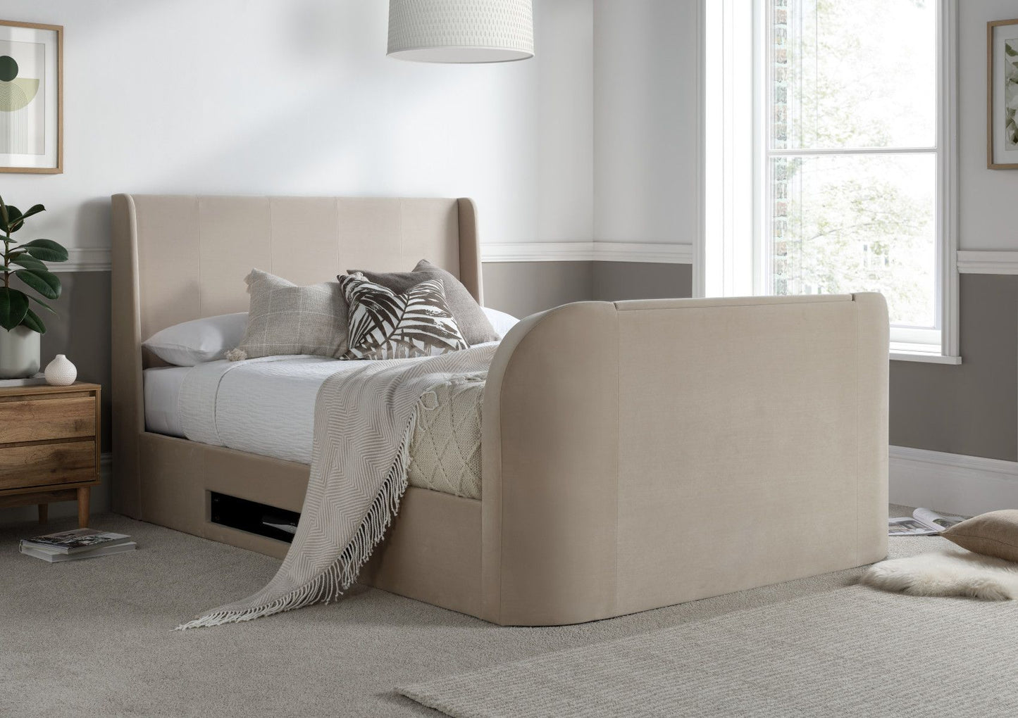 The Vancouver Ottoman Winged TV bed is the ideal choice for enjoying your favourite TV shows, movies, or video games from the comfort of your bed. With a remote-controlled TV lifting mechanism, this bed allows you to discreetly hide the TV when it's not in use. It can hold TVs up to 43 inches, with adjustable brackets to accommodate different sizes.