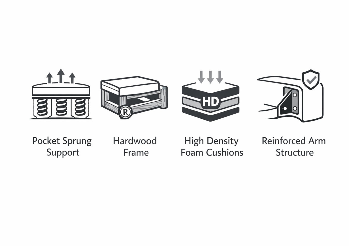 Comfort is at the heart of the design. The pocket sprung seat cushions combined with high-density foam provide excellent support, ensuring both relaxing seating and a restful night’s sleep. Built with a durable hardwood frame and reinforced, braced arms, this sofa bed delivers long-lasting strength and stability for everyday use.